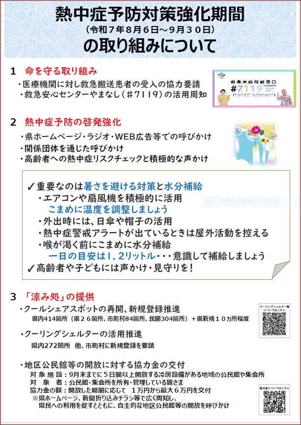山梨県では、今夏の酷暑に鑑み、緊急的な対策として、「熱中症予防対策強化期間」を実施することとしました。