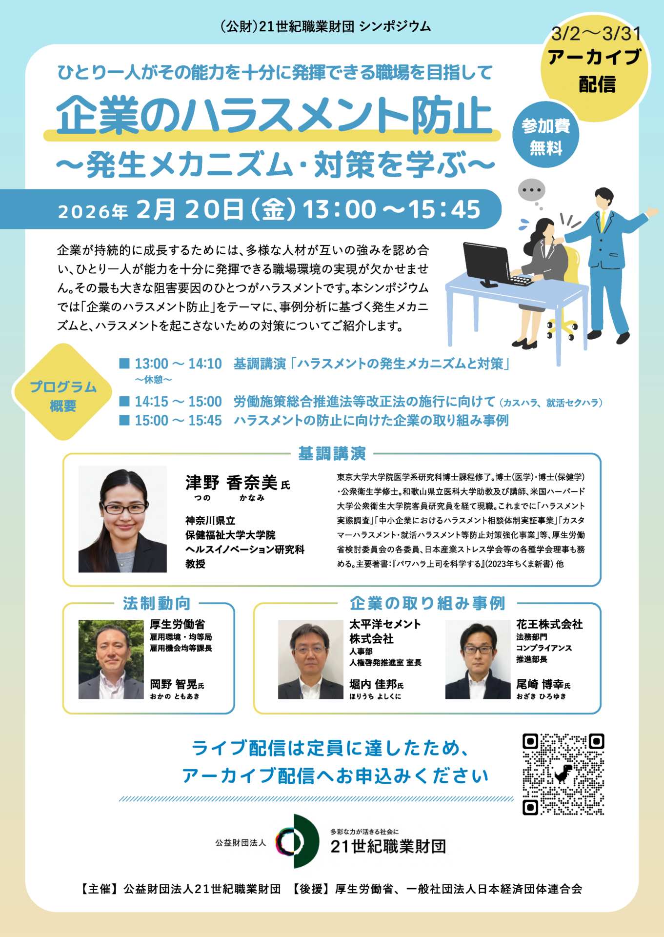 2026年02月16日更新21世紀職業財団シンポジウム「企業のハラスメント防止~発生メカニズム・対策を学ぶ~」アーカイブ配信のお知らせ